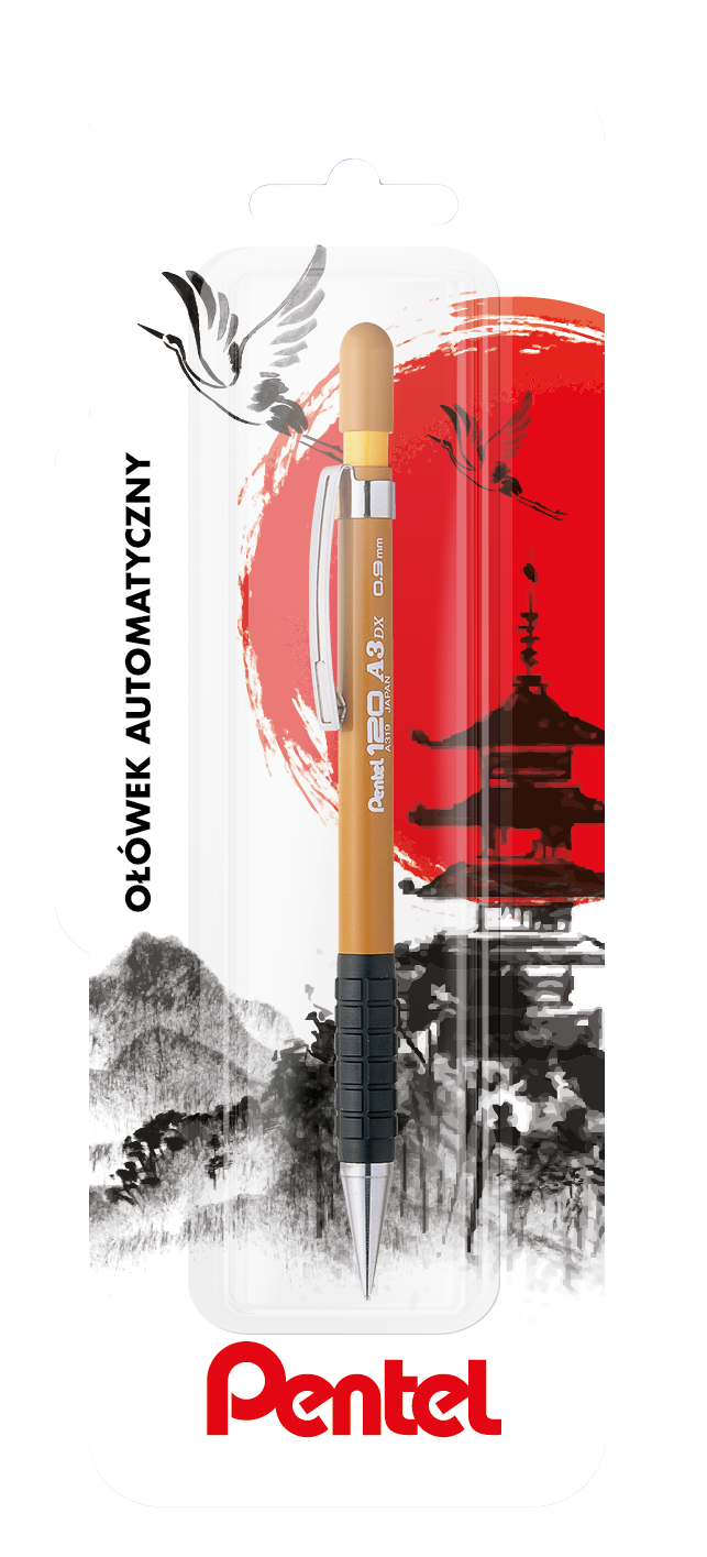 Specjalistyczy ołówek automatyczny. Idealny do prac kreślarskich, wykresów, jak również do zwykłego pisania. Posiada metalowy mechanizm zaciskowy, zdejmowany klips oraz gumkę wymienną. Dostępny w grubości 0,9 mm - ciemnożółty kolor obudowy. Pakowany na blistrze x 1 sztuka.