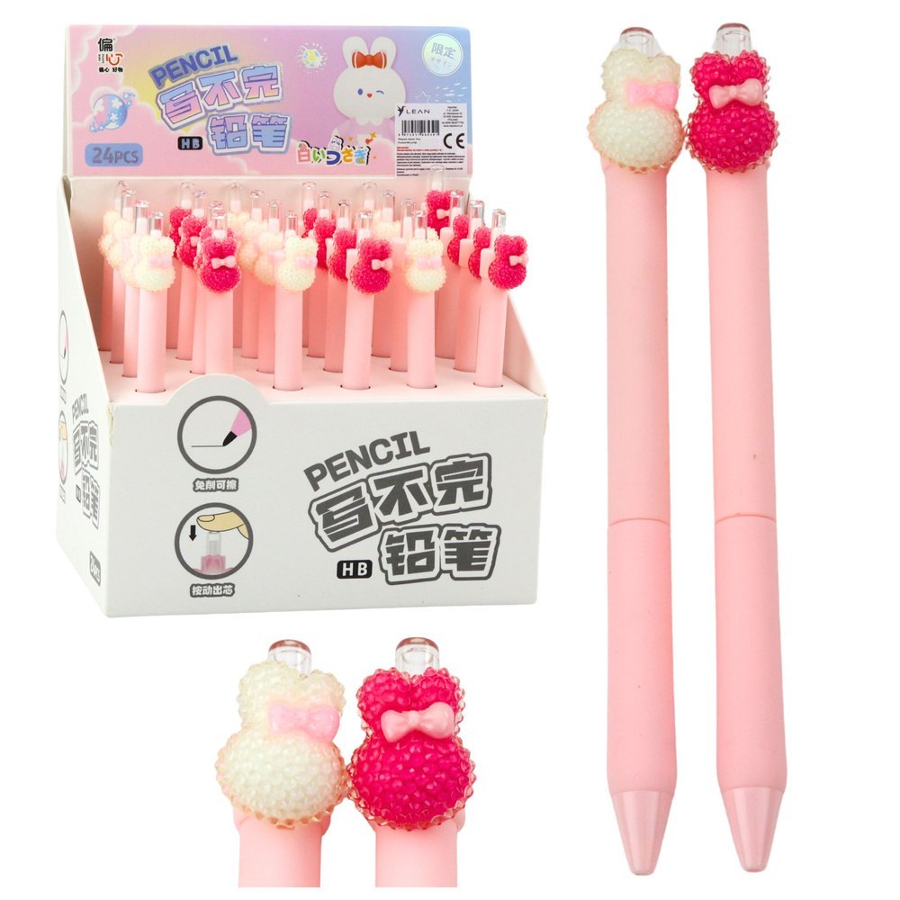 OŁÓWEK AUTOMATYCZNY Z OZDOBNYM KRÓLICZKIEM 15 CM Kolorowy ołówek automatyczny z uroczą ozdobą w kształcie króliczka to wyjątkowy artykuł piśmienniczy, który zachwyci zarówno dzieci, jak i dorosłych. Stylowy wygląd, pastelowy kolor i mieniąca się dekoracja sprawiają, że produkt wyróżnia się na tle klasycznych przyborów szkolnych. Ołówek ma długość 15 cm i został wykonany z lekkiego, ale solidnego tworzywa, zapewniając wygodę użytkowania. Mechanizm automatyczny ułatwia wysuwanie grafitu bez konieczności temperowania, co czyni ten produkt bardzo praktycznym zarówno w szkole, jak i w domu czy podczas kreatywnej zabawy. Urocza dekoracja przyciąga uwagę i może stanowić atrakcyjny dodatek do piórnika lub prezentu. W opakowaniu zbiorczym znajdują się 24szt. . SPECYFIKACJA: Długość całkowita: 15 cm Mechanizm: Automatyczny Materiał: Tworzywo sztuczne Końcówka: Wysuwana, precyzyjna Dekoracja: Króliczek z kokardką (różne kolory) Kolor obudowy: Pastelowy róż Typ grafitu: HB Zastosowanie: Do pisania, rysowania, szkicowania Przeznaczenie: Szkoła, dom, biuro ZAWARTOŚĆ ZESTAWU: Ołówek automatyczny 15 cm z dekoracją Grafit HB (w środku)