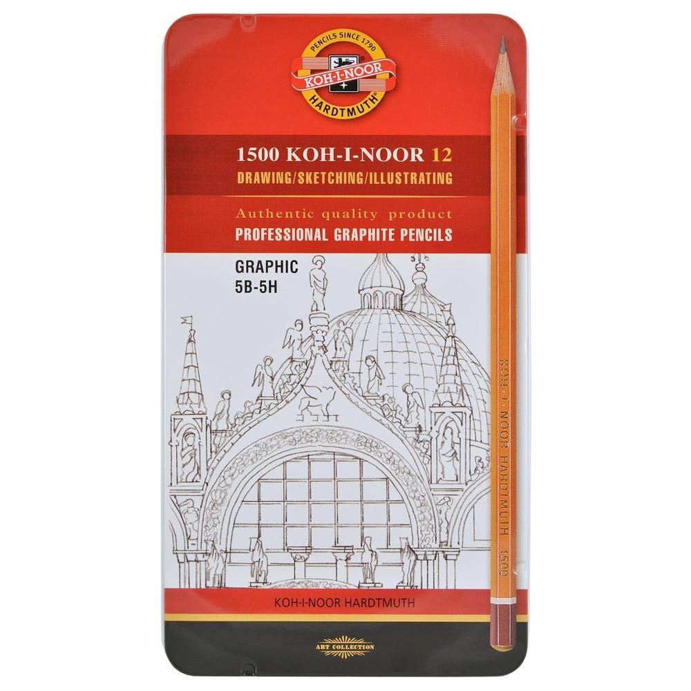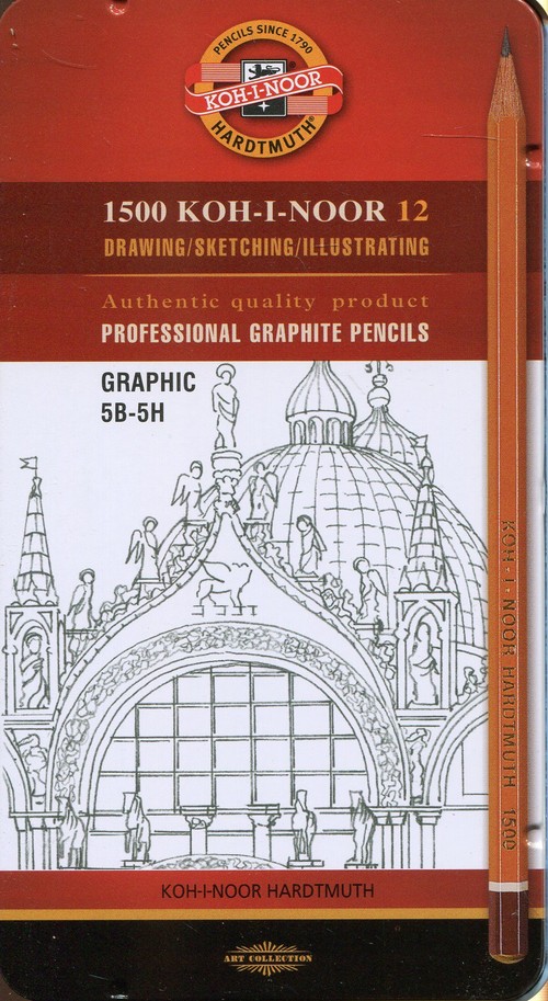 Zestaw artystycznych ołówków Koh-I-Noor 1502. Ołówki grafitowe Koh-I-Noor od dziesiecioleci cieszą się światową reputacją jako synonim jakości. Seria 1500 produkowana jest w 20 stopniowej wyjątkowo precyzyjnej skali gradacji, wyróżniają się wysoką transparentnością i łatwym usówaniem. Oprawki cedrowe tych sześciobocznych ołówków są wielokrotnie lakierowane. Zestaw artystyczny zawiera 12 ołówków średniej gradacji w metalowej kasecie od 5B do 5H polecane głównie grafikom do szkicowania, cieniowania oraz rysowania konturów.