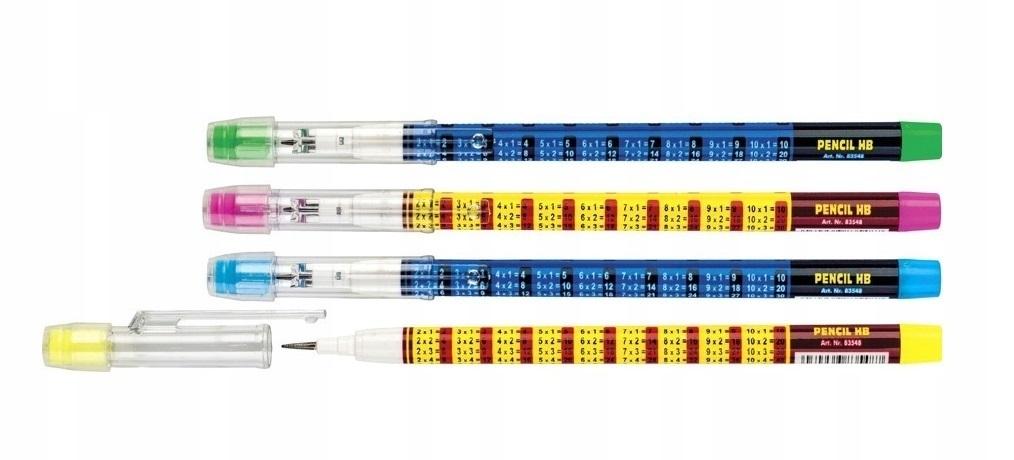 Ołówek HB z przekładanymi, naostrzonymi wkładami, tabliczka mnożenia na obudowie, z gumką.