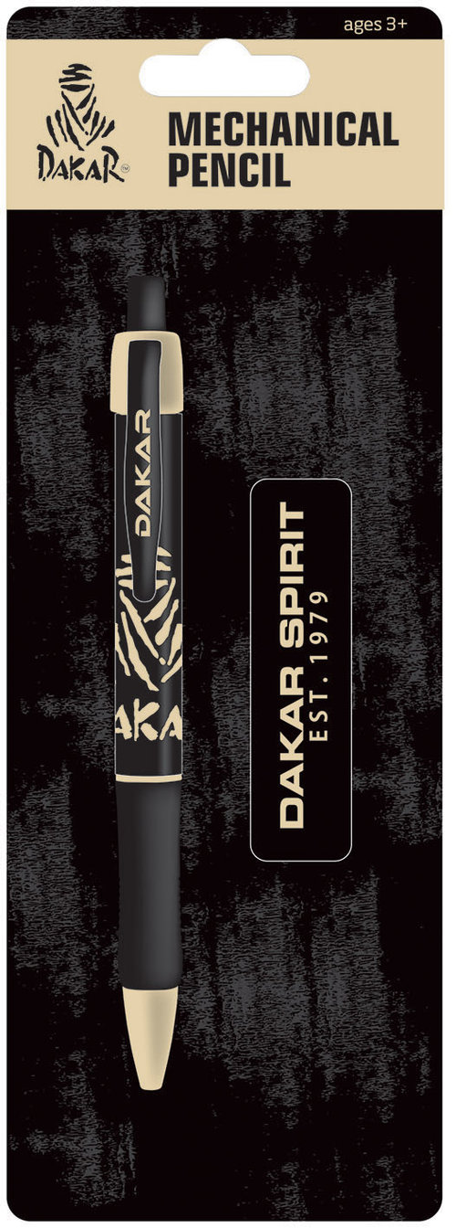 Mechaniczny ołówek z dodatkowymi wkładami na licencji Dakar. Dodatkowa gumka ułatwia trzymanie w ręku.