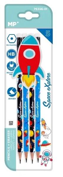 Ołówek sześciokątny HB z dodatkową gumką - Kosmos 4szt