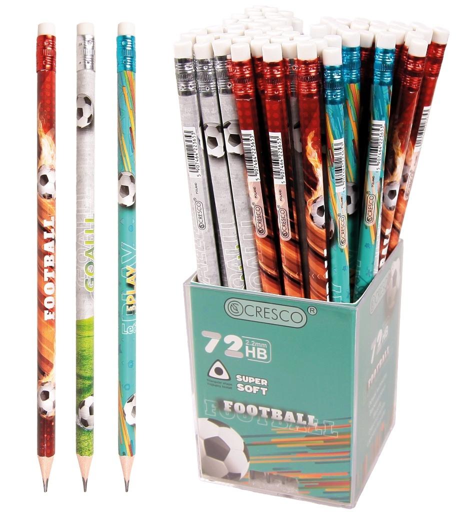 Ołówek FOOTBALL HB z gumką: twardość HB, ergonomiczny trójkątny kształt, odporny na łamanie, ciekawa piłkarska grafika. W opakowaniu 72szt
