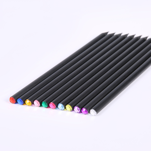 Zestaw czterech sztuk czarnych ołówków ozdobionych od góry akrylowym diamentem w różnych kolorach. Wymiary zestawu: 2,8x3,5xh21 cm.