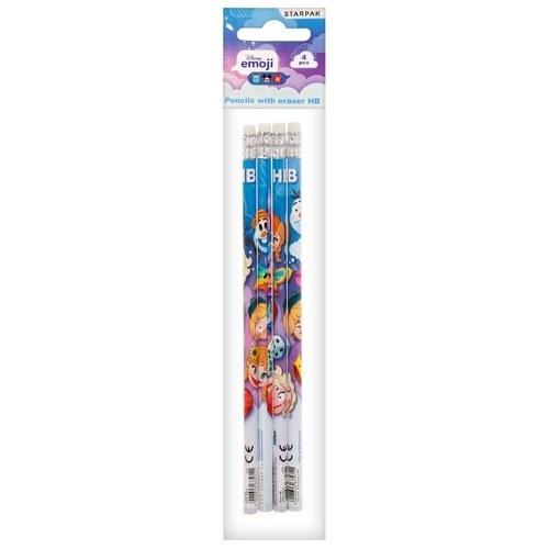 Zestaw 4 ołówków z gumką z kolekcji Starpak z licencją Emoji Frozen. Każdy ołówek zdobiony kolorową grafiką z ulubionymi bohaterami. Wykonany z trwałego drewna, zapewnia komfort rysowania i pisania. Ołówek nie łamie się podczas strugania, a gumka nie brudzi.