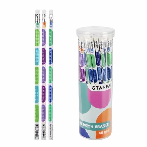 Ołówek nie łamie się podczas strugania, a gumka nie brudzi, ołówki to podstawowy produkt podczas nauki w szkole (rysowanie, matematyka, pisanie), łatwe w struganiu, nie łamią się, nie brudzą, uniwersalna twardość HB, każdy ołówek wyposażony w gumkę do mazania. Zestaw 48 ołówków z gumką zamkniętych w przeźroczystej tubie z kolekcji STARPAK. Wykonany z trwałego drewna, zapewnia komfort rysowania i pisania. Służy nie tylko do rysowania i szkicowania, ale jest również niezbędny podczas lekcji matematyki, do nauki pisania, do robienia notatek na marginesach książek lub zeszytów. Dlatego tak ważna jest jego jakość. Dzięki wysokiej jakości grafit nie sypie się, nie brudzi i nie kruszy. Twardość HB sprawia, że ołówki STARPAK są uniwersalne i mogą być wykorzystywane zarówno do pisania, jak tez rysowania. Zapoznaj się również z innymi produktami STARPAK z serii Tabliczka Mnożenia! Zawartość opakowania: 48 szt. ołówków z gumką. Wykonane z odpornego, nie łamiącego się podczas strugania grafitu. Wymiary/waga: wymiary produktu (dł.)[cm]: 19 cm, wymiary opakowania (wys. x szer.)[cm]: 20x7, waga produktu bez opakowania 1szt. [kg]: 0,01 kg, waga produktu w opakowaniu [kg]: 0,33 kg. Produkt przeznaczony dla dzieci w wieku: 3+. Ołówki pakowane w przeźroczystą tubę z zakręcanym wieczkiem.