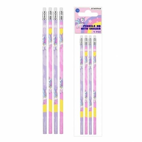 Ołówek nie łamie się podczas strugania, a gumka nie brudzi, ołówki to podstawowy produkt podczas nauki w szkole (rysowanie, matematyka, pisanie), łatwe w struganiu, nie łamią się, nie brudzą, uniwersalna twardość HB, każdy ołówek wyposażony w gumkę do mazania. Zestaw 4 ołówków z gumką z kolekcji STARPAK z grafiką w Jednorożce. Każdy ołówek zdobiony kolorową grafiką z ulubionymi bohaterami. Wykonany z trwałego drewna, zapewnia komfort rysowania i pisania. Służy nie tylko do rysowania i szkicowania, ale jest również niezbędny podczas lekcji matematyki, do nauki pisania, do robienia notatek na marginesach książek lub zeszytów. Dlatego tak ważna jest jego jakość. Dzięki wysokiej jakości grafit nie sypie się, nie brudzi i nie kruszy. Twardość HB sprawia, że ołówki STARPAK są uniwersalne i mogą być wykorzystywane zarówno do pisania, jak tez rysowania. Zapoznaj się również z innymi produktami STARPAK z serii Unicorn! Zawartość opakowania: 4 szt. ołówków z gumką. Wykonane z odpornego, nie łamiącego się podczas strugania grafitu. Wymiary/waga: wymiary produktu (dł.)[cm]: 19 cm, wymiary opakowania (wys. x szer. x gł.)[cm]: 25x5x1, waga produktu bez opakowania 1szt.[kg]: 0,01 kg, waga produktu w opakowaniu [kg]: 0,02 kg. Produkt przeznaczony dla dzieci w wieku: 3+. Ołówki pakowane w folię z zawieszką.