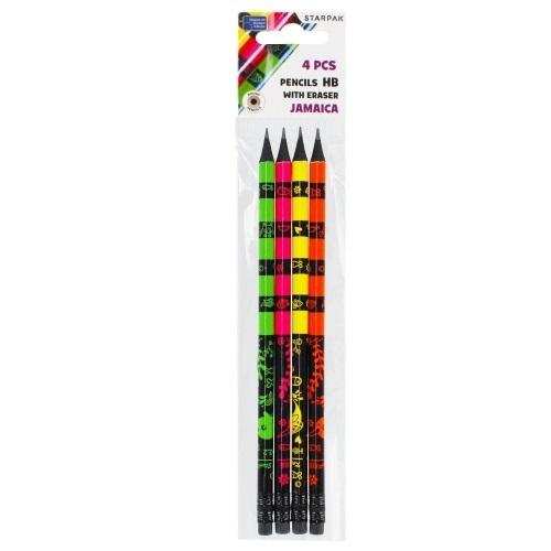 Zestaw 4 ołówków okrągłych z gumką Jamajka z kolekcji STARPAK. Każdy ołówek wykonany z trwałego drewna, zakończony gumką do mazania zapewnia komfort rysowania i pisania. Ołówek nie łamie się podczas strugania a gumka nie brudzi.