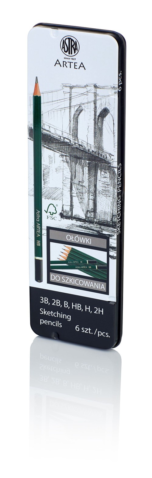 W zestawie ołówki o twardości: 3B, 2B, B, HB, H, 2H.