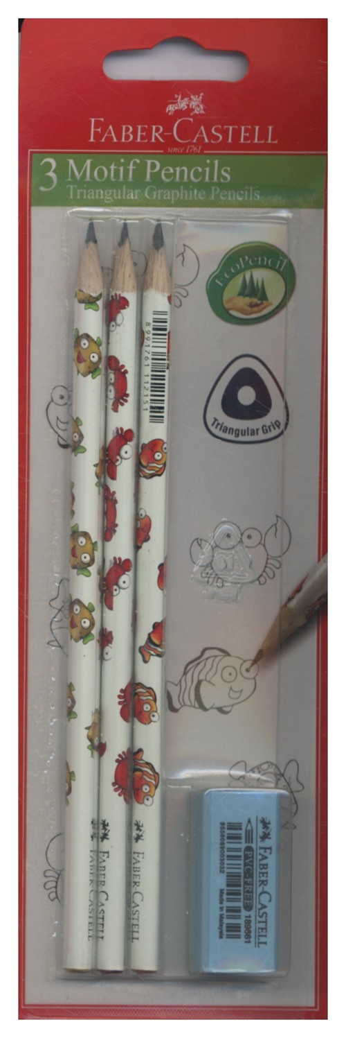 Zestaw ołówków grafitowych Faber-Castell 3 szt. z kolorowym nadrukiem z motywem podwodnym z gumką Dust-Free w opakowaniu blistrowym. Standardowe i niezawodne. Ergonomiczny trójkątny kształt zapewnia wysoki komfort użytkowania i niemęczące, wygodne pisanie i szkicowanie. Odpowiednie również dla leworęcznych. Z odpornym na pękanie grafitem o stopniu twardości B, dzięki bezpiecznemu procesowi wiązania (SV). Wykonane z miękkiego drewna, łatwego do zatemperowania.