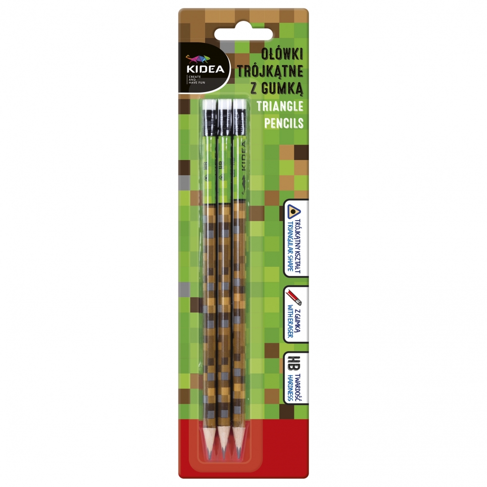 Zestaw 3 trójkątnych ołówków z gamerskim, pikselowym nadrukiem. Ołówki idealne dla fanów gier komputerowych. Ergonomiczny i trójkątny kształt ułatwi prawidłowy chwyt i wygodne użytkowanie.
