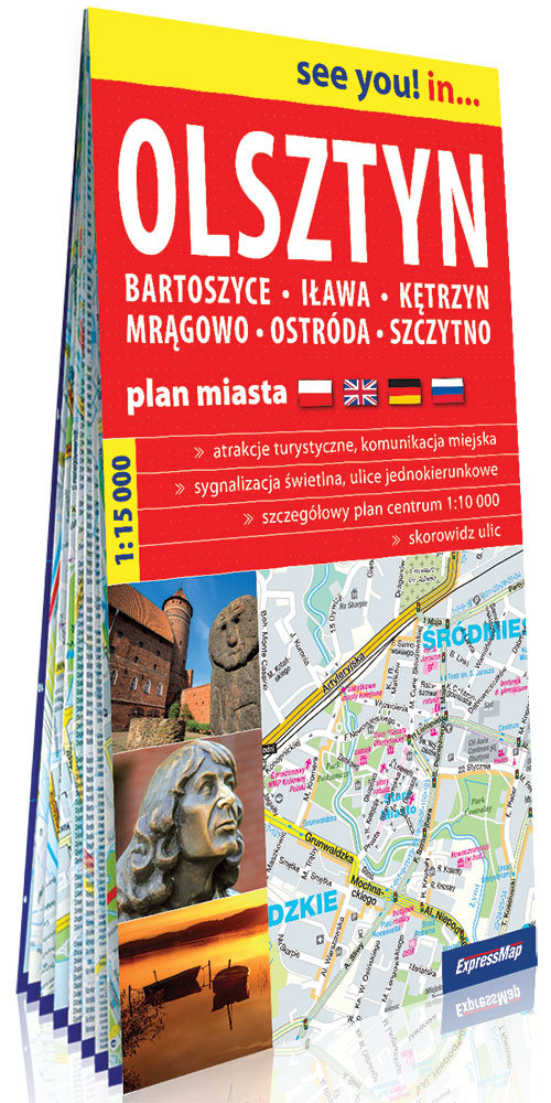 Spacer po Starym Mieście, wizyta w Planetarium i Obserwatorium Astronomicznym, a może relaks nad jeziorem Ukiel? W Olsztynie na turystów czeka wiele atrakcji. Z naszą papierową mapą największego miasta Warmii bez trudu można je odnaleźć. Publikacja zawiera m.in: - linie autobusowe wraz z przystankami, - sygnalizację świetlną, ulice jednokierunkowe, parkingi, - bogatą treść turystyczną, m.in.: zabytki, muzea, hotele i inne istotne obiekty, - budynki użyteczności publicznej, centra handlowe, - szczegółowy plan centrum w skali 1:10 000 (1 cm – 100 m), - dodatkowe plany Bartoszyc, Iławy, Kętrzyna, Mrągowa, Ostródy i Szczytna w szczegółowej skali 1:15 000 (1 cm – 150 m), - skorowidz ulic. Produkty z serii see you! in to tradycyjne mapy papierowe. Dołączamy do nich plastikowe etui, które chroni publikację przed wilgocią i uszkodzeniem. Jakość w przystępnej cenie. Seria obejmuje zarówno mapy samochodowe oraz plany miast, jak i mapy turystyczne.