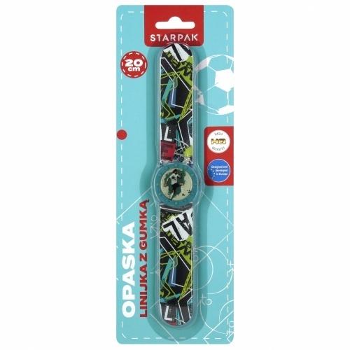 Nowość w naszej ofercie doskonała niełamliwa linijka z silikonu w formie opaski na rękę. Na opasce znajduje się gumka do mazania wyglądająca jak tarcza zegarka. Doskonałe rozwiązanie do szkoły dzięki któremu podstawowe przybory szkolne masz pod ręką...a raczej na ręce. Opaska posiada kolorową chłopięcą grafikę. Zapoznaj się również z innymi produktami Starpak dedykowane szkole. Wymiary/waga: wymiary produktu (dł. x szer.) [cm]: 21,5x3,5, wymiary opakowania (wys. x szer. x gł.) [cm]: 26x9x1, waga produktu bez opakowani [kg]: 0,03 kg, waga produktu w opakowaniu [kg]: 0,04 kg. Pakowany w kartonik z zawieszką.