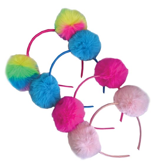 Opaska na włosy obleczona materiałem, z przyczepionymi dwoma włochatymi pomponami. Cztery wersje kolorystyczne: błękitna, jasno różowa, różowa, tęczowa.