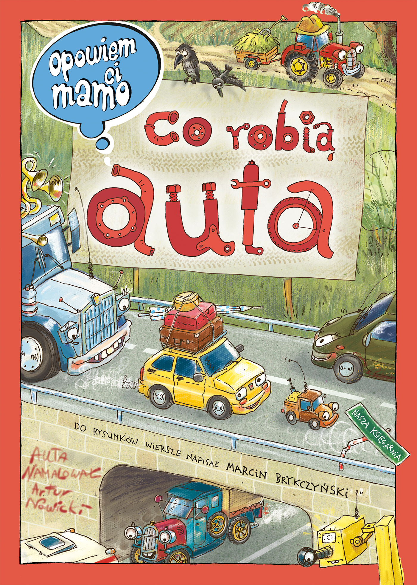 Wspaniała książka dla najmłodszych fanów motoryzacji! Jakie samochody pracują w mieście, a jakie na wsi? Co kryje w sobie wnętrze samochodu? Jakie pojazdy ścigają się po torze wyścigowym, a jakie pracują na placu budowy? Dlaczego w warsztacie samochodowym jest taki bałagan? Co robią samochody zimą, a co w lecie? Gdzie można spotkać najnowsze i najpiękniejsze modele samochodów? Odpowiedzi na te i inne pytania dotyczące bogatego świata pojazdów dużych i małych znalazły się w tej niezwykłej książce narysowanej z humorem przez Artura Nowickiego. „Opowiem ci, mamo, co robią auta” to znakomity prezent dla dzieci w wieku od 2 do 6 lat. Książka ćwiczy spostrzegawczość, umiejętność opowiadania, ilustracje wzbogacają rymowane zagadki Marcina Brykczyńskiego, a sztywne kartki pozwolą jej przetrwać wielokrotne przeglądanie. Artur Nowicki jako chłopiec marzył, żeby zostać pilotem, dlatego najczęściej rysował samoloty. Później chciał być czołgistą i zaczął rysować same bitwy pod Studziankami. Myślał też o karierze krawca, ale nic z tego nie wyszło. Tata łamał sobie głowę, co z niego wyrośnie, a mama często mówiła, że chyba ksiądz, lecz nieznane są źródła tego pomysłu. Ostatecznie ukończył szkołę średnią jako mechanizator rolnictwa. Nie zdążył jednak popracować w zawodzie, bo zrozumiał, że to, co lubi najbardziej, to malowanie. Dlatego zdecydował się na studia na Wydziale Wychowania Artystycznego WSP w Częstochowie (obecnie Akademia Jana Długosza). W 1993 roku otrzymał dyplom z wyróżnieniem w pracowni prof. Jerzego Filipa Sztuki. Od ponad dwudziestu lat tworzy ilustracje do czasopism i książek dla dzieci. Organizuje i prowadzi spotkania oraz warsztaty twórcze dla dzieci i młodzieży. Mieszka z rodziną na wsi. Spędza dużo czasu w pracowni, gdzie wymyśla i rysuje bohaterów kolejnych książek. Marcin Brykczyński – ekonomista z wykształcenia, poeta z powołania. Laureat licznych nagród, w tym Polskiego Towarzystwa Wydawców Książek, Polskiej Sekcji IBBY oraz Fundacji Świat Dziecka. Znakiem rozpoznawczym jego twórczości dla najmłodszych są błyskotliwe zabawy słowne, oryginalne poczucie humoru i optymistyczne spojrzenie na świat. Znany z odważnego podejścia do trudnych tematów, Marcin Brykczyński napisał „Skąd się biorą dzieci” oraz zbiór wierszowanych interpretacji encyklik papieskich „W każdym z nas są drzwi do nieba. Jan Paweł II nie tylko dla dzieci”. Wiele publikacji tego autora ma charakter edukacyjny – „Liczydełko” zaznajamia z tajemnicami liczb, wiecznie głodny, zjadający literki potwór z „Alfabestii” uczy alfabetu. W „Naszej Księgarni” poeta wydał . „Białego niedźwiedzia, czarną krowę” (z ilustracjami Grażki Lange), pozycję umieszczoną na Liście Honorowej IBBY. Powyższy opis pochodzi od wydawcy.