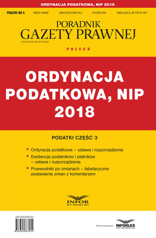 Publikacja zawiera komplet podstawowych przepisów podatkowych: •Ordynację podatkową, •ustawę o ewidencji i identyfikacji podatników i płatników (NIP), •wybrane przepisy wykonawcze (rozporządzenia w sprawach podatkowych) obowiązujące w 2018 r., wydane na podstawie przepisów ustaw podatkowych. W publikacji zamieszczono również przewodniki po zmianach w przepisach Ordynacji podatkowej i NIP w formie tabelarycznej. Przewodniki zawierają porównanie treści przepisów przed i po zmianie oraz komentarze ekspertów objaśniające każdą wprowadzoną zmianę. Dzięki temu łatwo można dowiedzieć się nie tylko, na czym polega zmiana, ale też dlaczego została wprowadzona i czemu ma służyć
