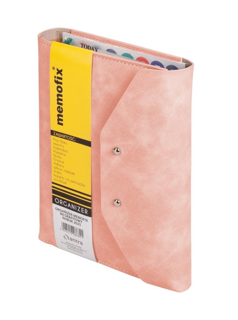 Organizer B6 Materiał: nubuk Zamknięcie: knopiki Organizer posiada: wkład kalendarzowy 2025 (TDW - tydzień do wglądu), pamiętaj, notes, finanse, adresy od A do Z, linijkę 15 cm, 3 koperty na wizytówki, 3 koperty zasuwane, zestaw 4 naklejek tematycznych, Organizer posiada miejsce na długopis oraz kieszonki. Do organizera można również dokupić inne wkłady (kategoria: wkłady do organizerów - format B6).