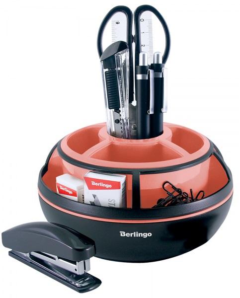 Stylowy obrotowy organizer biurkowy Berlingo "Instinct" z wypełnieniem. Design składający się z połączenia dwóch kontrastujących kolorów. Wysokiej jakości plastik, błyszcząca powierzchnia. Organizer obraca się o 360 stopni. Wypełnienie obejmuje: ołówek, automatyczny długopis, zszywacz, nożyczki, nóż, linijkę, spinacze do papieru, gumkę, zszywki. Kolor: różowo-czarny.