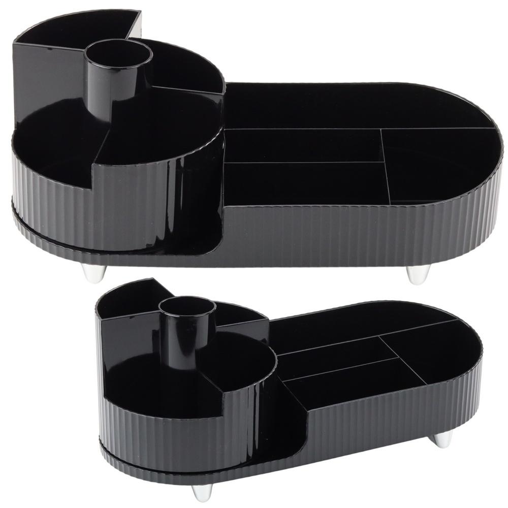 ORGANIZER NA KOSMETYKI OBROTOWY CZARNY DUŻY Elegancki, obrotowy organizer w kolorze czarnym to uniwersalne i funkcjonalne rozwiązanie, które doskonale sprawdzi się zarówno w łazience, jak i na biurku. Dzięki przemyślanej konstrukcji i praktycznym przegrodom, produkt ten umożliwia wygodne przechowywanie. Może być także praktycznym rozwiązaniem na biurko do przechowywania przyborów szkolnych i biurowych. Organizer wyposażony jest w mechanizm obrotowy 360, który zapewnia szybki i łatwy dostęp do zawartości. Sprawdzi się idealnie jako pojemnik na pędzle do makijażu, szminki, korektory, flakony perfum, ale również jako organizator na długopisy, nożyczki, markery, zakreślacze, spinacze czy inne drobne akcesoria biurowe. Czarne ryflowane ścianki nadają mu nowoczesnego i eleganckiego wyglądu, który pasuje zarówno do wnętrz domowych, jak i przestrzeni biurowych czy szkolnych. Solidne wykonanie z trwałego tworzywa sztucznego zapewnia długotrwałe użytkowanie, odporność na zarysowania oraz łatwość w utrzymaniu czystości. To rozwiązanie idealne dla każdego, kto ceni organizację, porządek i estetykę - niezależnie od tego, czy używa go na toaletce, czy na biurku. SPECYFIKACJA: Wymiary: 34,5 cm x 14,7 cm x 14,3 cm Wymiary opakowania: 35 x 17 x 16cm Kolor: czarny Materiał: tworzywo sztuczne Obrotowy: tak, 360 ZAWARTOŚĆ ZESTAWU: 1x organizer obrotowy z przegrodami