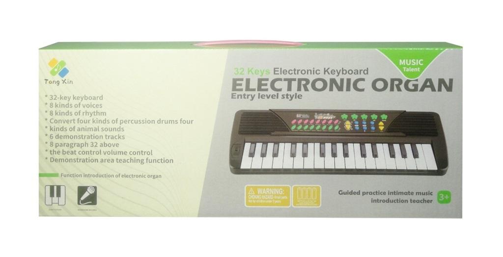 Muzyczny zestaw dla małego fana elektronicznej muzyki. Organki posiadają 32 klawisze z całą gamą dźwięków, wgranych gotowych melodii, rytmów, tonów i odgłosów zwierząt. W czasie tworzenia muzyki dziecko otrzymuje możliwość regulacji tempa, tonów, itp. Do organków dołączono także mikrofon. Zabawka zawiera zasilacz. Zabawka działa na baterie typu AA. Baterie nie są załączone do zabawki. Produkt zapakowany w kartonowe opakowanie z przezroczystym okienkiem. Podane wymiary są wymiarami opakowa