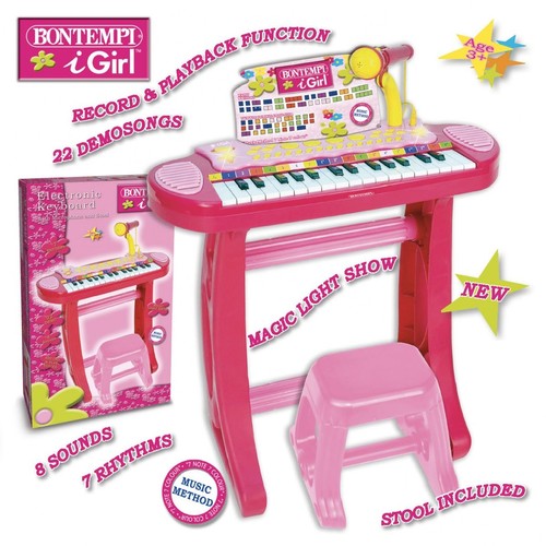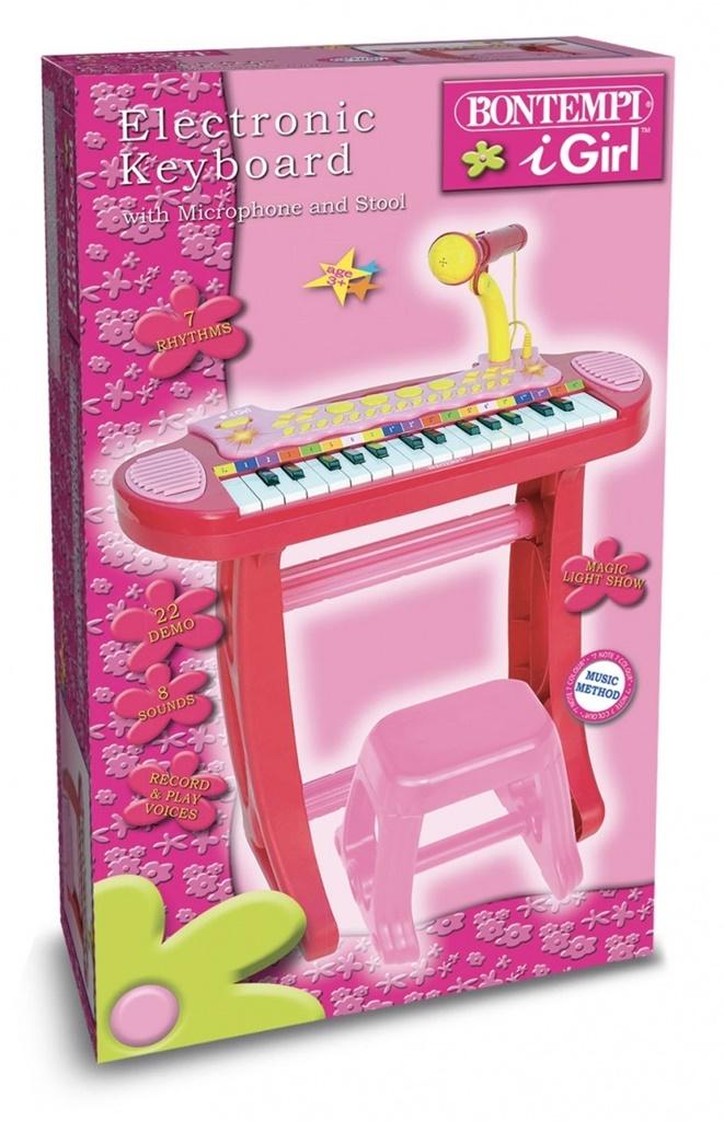 Organy elektroniczne włoskiej firmy Bontempi, to wymarzona zabawka młodego klawiszowca. Instrument zawiera: statyw do wysokości 61cm, 31 klawiszy, 22 melodie, 8 dźwięków, 7 rytmów, 4 dźwięki perkusyjne, funkcję nagrywana i odtwarzania, regulację głośności oraz tempa, efekty świetlne, funkcję automatycznego wyłączania, mikrofon oraz stołek. Wymiary produktu 45 x 48 x 65cm. Zasilanie 4xR6/AA 1,5V (nie dołączono do zestawu).