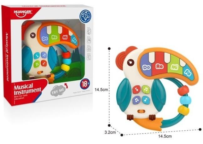 Głównym elementem jest dziób tukana, który pełni funkcję pianinka z kolorowymi klawiszami oznaczonymi nutami Do Re Mi Fa. Wesołe dźwięki stymulują słuch, a nauka przyczynowo-skutkowa rozwijana jest poprzez naciskanie przycisków i obserwowanie reakcji. Na tułowiu zabawki znajdują się dodatkowe przyciski funkcyjne, które urozmaicają zabawę i oferują różnorodne melodie oraz efekty dźwiękowe.