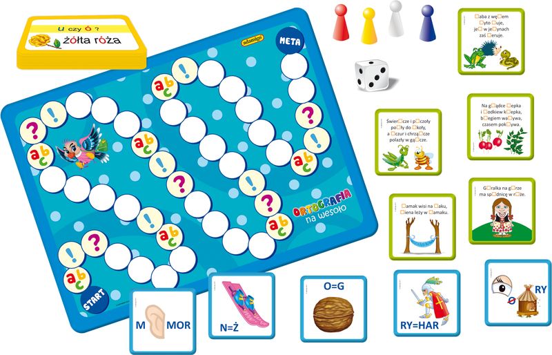 Quiz „Ortografia na wesoło” zawiera aż 54 karty z pułapkami ortograficznymi wraz z odpowiedziami, planszę, 24 kartoniki z wierszami i zagadkami, pionki oraz kostkę do gry. Zachęcamy do wesołej zabawy, podczas której gracze utrwalą pisownię wyrazów z: ż, rz, ch, h, ó, u. Celem gry jest nauka ortografii w konwencji szlachetnej rywalizacji, poprzez wzrokowe kodowanie trudnych wyrazów. Śmieszne i żartobliwe wierszyki pozwolą na skuteczne utrwalenie poprawnej, niełatwej polskiej pisowni. Wiek: 6+ Liczba graczy: 2-4