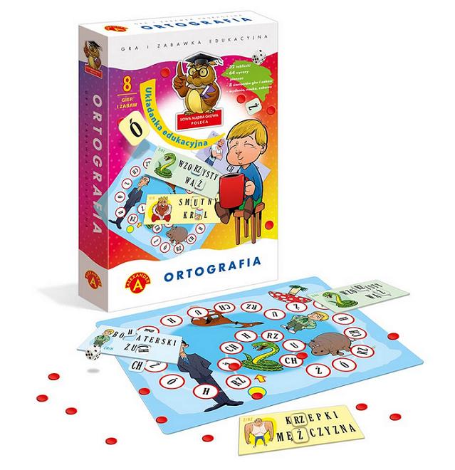 "Ortografia" jest zbiorem zabaw i gier, których uczestnicy łączą zabawę z nauką poprawnej pisowni wyrazów zawierających litery: h i ch, u i ó, ż i rz. Tabliczki z wyrazami Maja otwory, w które można włożyć tylko właściwą literę dla danego wyrazu, co daje pewność poprawnej pisowni. Proponowane gry i zabawy sa także dobrym treningiem koncentracji , spostrzegawczości i pamięci. Zawartość pudełka: 32 tabliczki z literami, plansza, pionek, kostka, 40 żetonów, instrukcja.