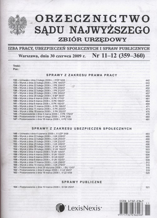 Orzecznictwo Sądu Najwyższego Izba Pracy, Ubezpieczeń Społecznych i Spraw Publicznych Zbiór Urzędowy 11-12/2009