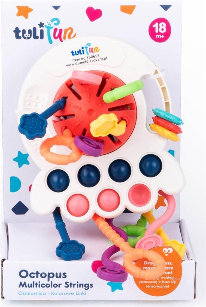 Sensoryczna ośmiornica zapewni maluchowi moc atrakcji w domu i na spacerze! Zabawka wyposażona została w kolorowe kropeczki do wciskania, linki do przeciągania i koraliki do obracania. Te precyzyjne czynności pomogą najmłodszym ćwiczyć motorykę małą. Antypoślizgowy uchwyt z wypustkami ułatwi chwytanie zabawki.