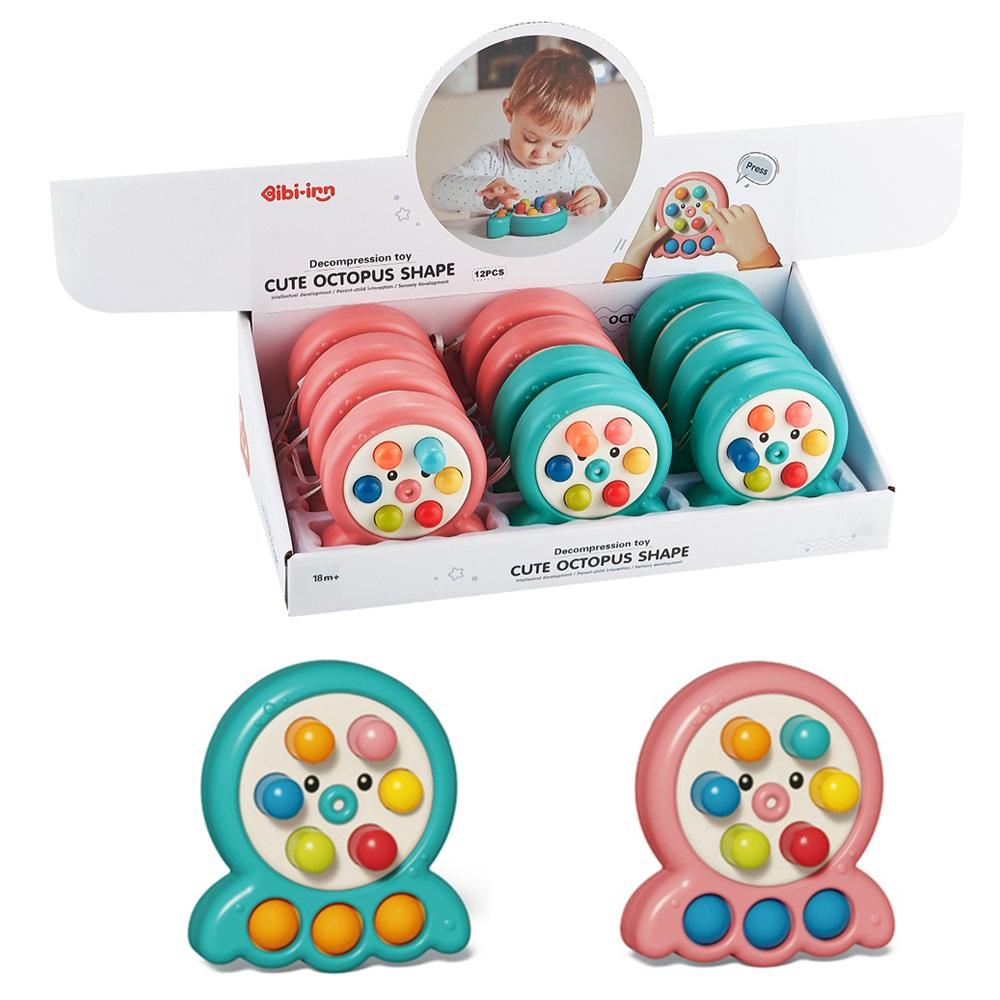 Ośmiorniczka posiada plastikowe przyciski - po wciśnięciu jednego, inny wyskoczy. Na dole posiada trzy silikonowe przyciski. Występuje w dwóch kolorach w mixie. W displayu - 12 szt.