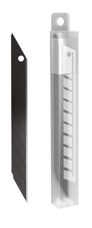 Ostrza do noża biurowego, szer. 9mm. Wymienne czarne ostrza o kącie 30. Zrobione ze stali SK2. SK2 to rodzaj stali matrycowej o wysokiej twardości, odporności na zużycie, wytrzymałości i obróbki. Ukośne grawerowanie laserowe pozwala na odłamanie zużytej częsci noża dokładnie w miejscu zaznaczenia. Ostrza zapakowane są w plastikowym etui 5 szt. Opakowanie jednostkowe - blister z zawieszką euro.