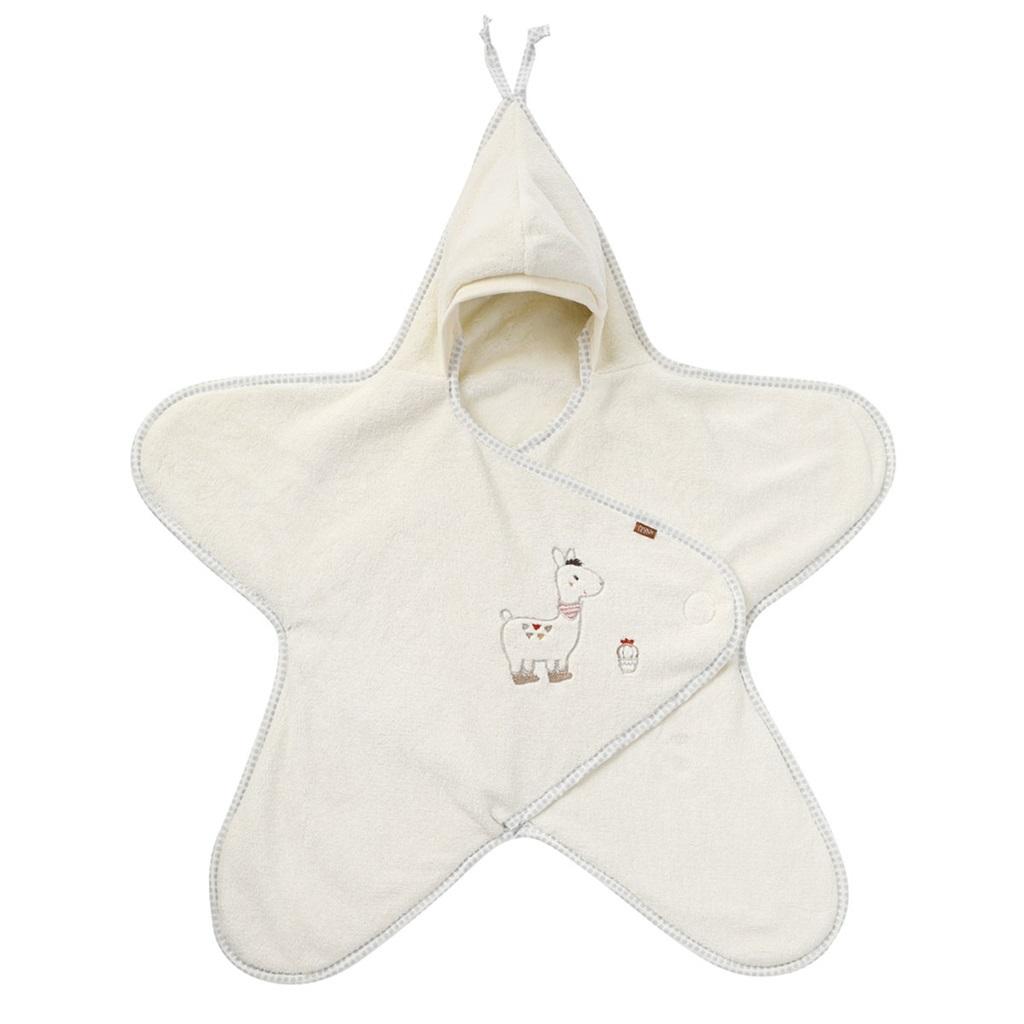 Puszysty otulacz (koc) w kształcie gwiazdy zapinany na rzep, ozdobiony aplikacją Lamyprzeznaczony jest do użytku po kąpieli lub na podróż.