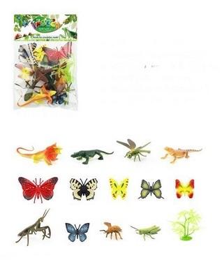 Zestaw 14 figurek owadów, gadów i akcesorii np. motyle, świerszcz, drzewko. Zabawka zapakowana w przezroczysty worek. Produkt dla dzieci od 3 lat. Podane wymiary są wymiarami opakowania.