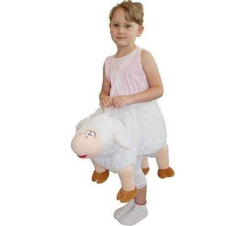 Strój na szelkach. Wymiary: obwód otworu maskotki 82 cm długość szelek 35-68 (regulowane) długość z tyłu ok. 50 cm długość z przodu ok. 70 cm bardzo mięciutki w dotyku strój owieczki wykonany jest z miękkiego, lśniącego materiału - pluszu całość w kolorze białym na głowie plastikowe oczy oraz odstające uszy na czubku tasiemka do podtrzymywania głowy z tyłu puszysty ogonek kostium z boku na całej długości posiada rzep, który ułatwia jego założenie całość trzyma się za pomocą szelek z regulacją długości