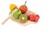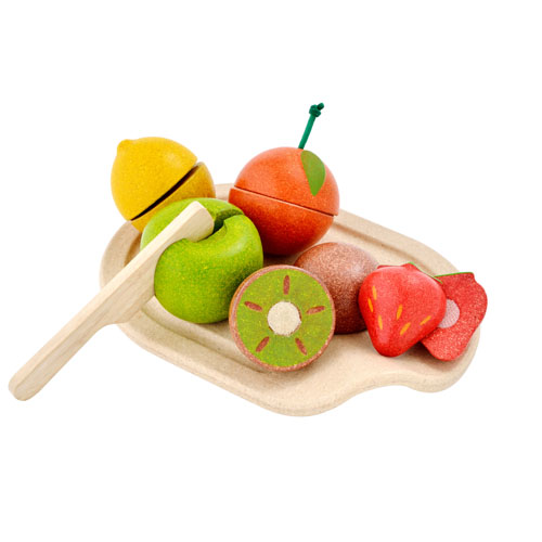 Zestaw smakowitych owoców z nożykiem i deską do krojenia. Pomarańcza, cytryna, kiwi, jabłko i truskawka mają w środku rzep, dzięki któremu można je kroić na pół i z powrotem składać w całość. 18m+