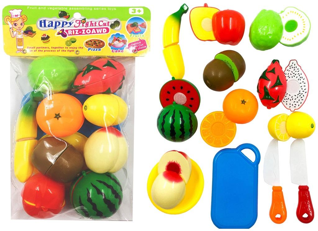 Zestaw owoców do krojenia z deską i nożami. Owoce łączone rzepem dają się kroić dołączonym do zestawu bezpiecznym, plastikowym nożem. Zabawka edukacyjna, uczy łączenia kształtów, znajomości owoców, prawidłowego trzymania i krojenia nożykiem.