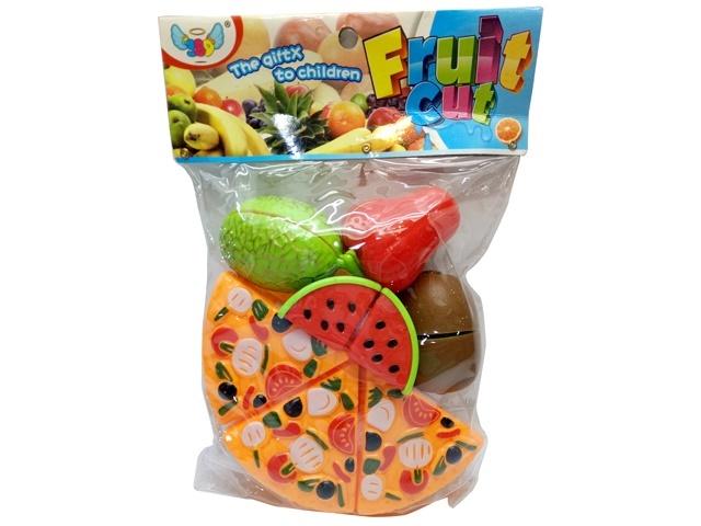 Zestaw platikowych artykułów spożywczych i owoców wraz z nożem i deską. Owoce są poprzekrawane na pół.