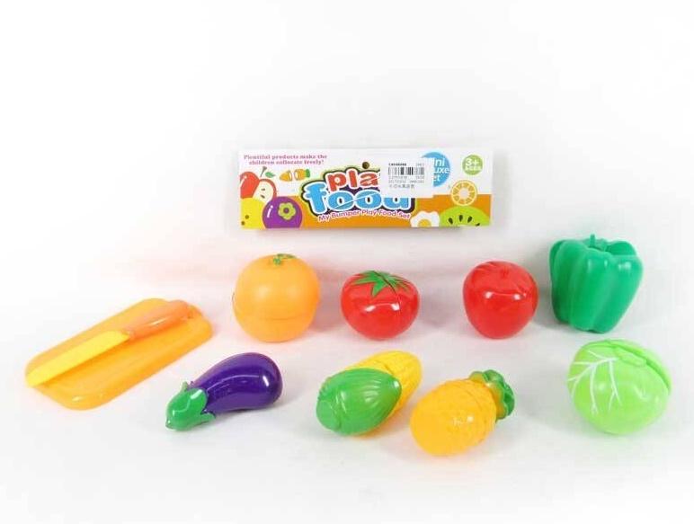 Owoce i warzywa do krojenia, zapakowane w worek. Dodatkowe akcesoria: nóż, deska do krojenia. Produkt nie potrzebuje baterii. Zabawka przeznaczona dla dzieci powyżej 3 roku życia.