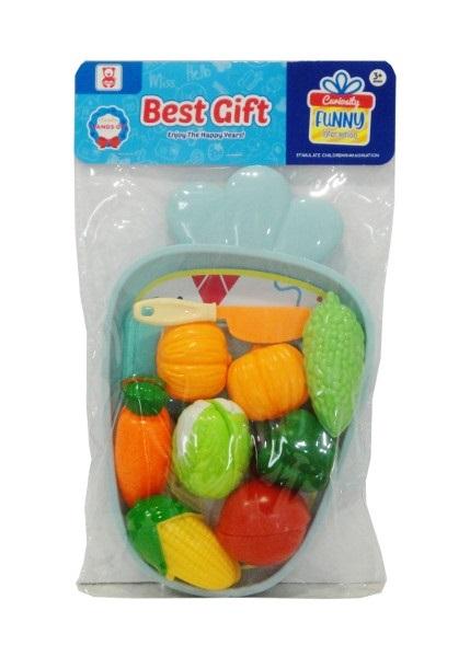 Zestaw warzyw do krojenia. W zestawie znalazły się m.in.: dynia, pomidor, papryka, kukurydza, marchewka, kapusta pekińska, nóż, deseczka oraz taca w kształcie truskawki. Produkt zapakowany w przezroczysty worek. Zabawka dla dzieci od 3 lat. Podane wymiary są wymiarami opakowania.