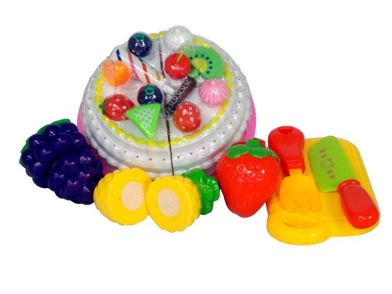 Kolorowy tort oraz owoce (ananas, truskawka, winogrono) do krojenia. Ponadto zestaw zawiera nóż, widelec oraz deskę do krojenia. Całość spakowana w foliowy worek. Podane wymiary są wymiarami opakowania.