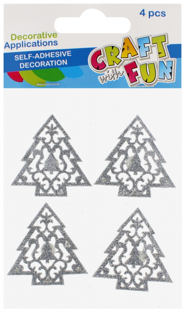 Zawartość opakowania 4 naklejek brokatowych Choinek w srebrnym kolorze.