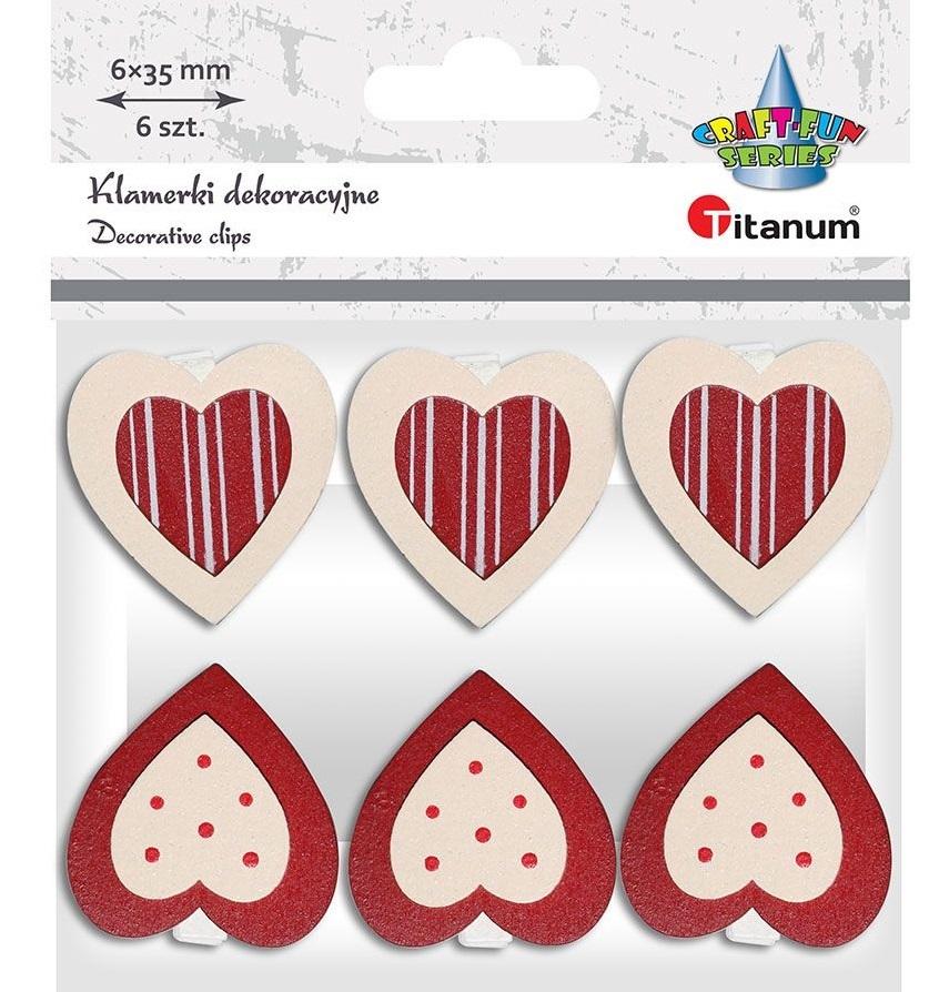 Drewniane klamerki z dekorem serce. Wymiary klamerki: 7 x 35 mm, wymiary dekoru: 38 x 40 mm. Kolory: klamerka - biała, serce - czerwono-beżowe. Opakowanie 6 szt.