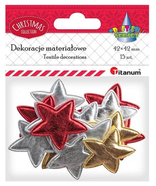 Aplikacje materiałowe gwiazdki 44x44mm czerwone, złote, srebrne 15szt.