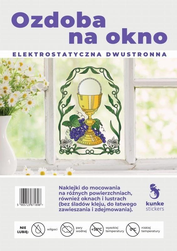 Elegancka naklejka elektrostatyczna z motywem kielicha eucharystycznego to piękna i symboliczna dekoracja, idealna na uroczystości Bożego Ciała oraz Pierwszej Komunii Świętej.