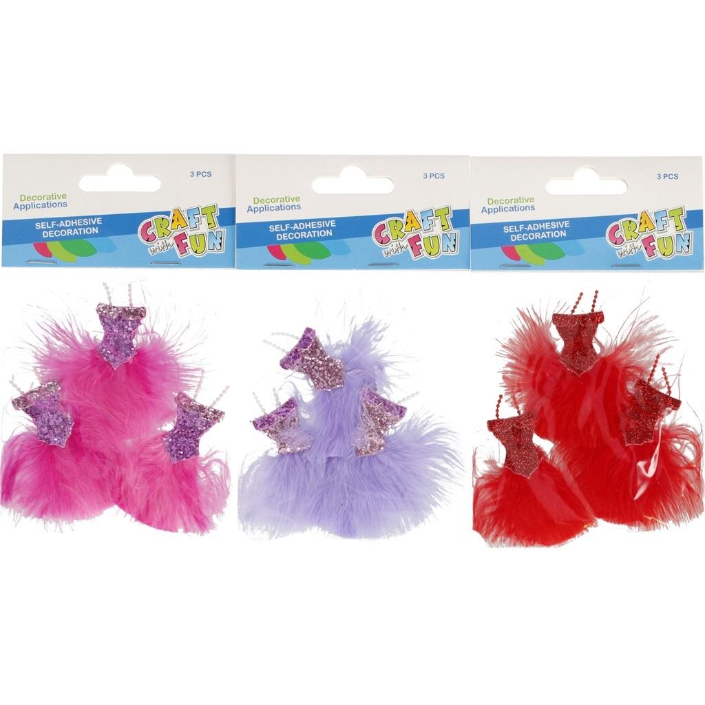 Zawartość opakowania: 3x samoprzylepna Sukienka . Ozdoba wykonana z piórka i z tworzywa sztucznego.