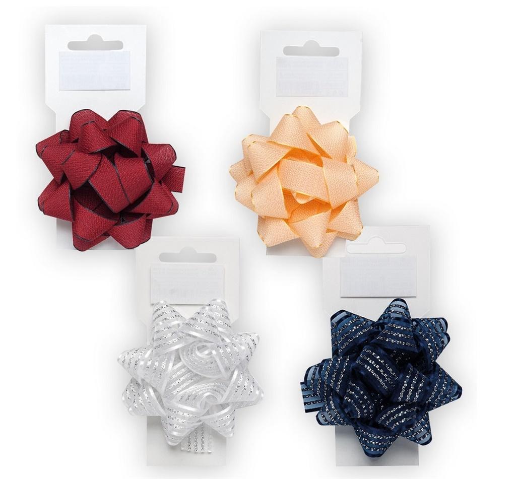 Ozdobna kokarda w różnych kolorach o wielkości 10 cm, zaczepiona na blistrze.