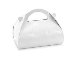 Ozdobne pudełka na ciasto z papieru w kolorze białym. Na pudełku błyszczący, perłowy nadruk gałązek z listkami i kwiatkami. Set zawiera 10 sztuk, wymiary pudełka po złożeniu ok. 16x15x8 cm. Pudełka do samodzielnego złożenia bez użycia kleju.(1 op. / 10 szt.)