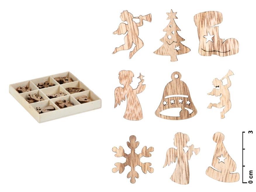 Dekoracja bożonarodzeniowa 3cm/27 szt. Udekoruj swój dom i poczuj magię Bożego Narodzenia! Każda ozdoba posiada zawieszkę. Można ją zawiesić na choince, drzwiach, oknie lub ozdobić mieszkanie na Święta. ZESTAW ZAWIERA: - 27 sztuk ozdób drewnianych Dostarczane w drewnianym pudełku z przegródkami. Wymiar: 105mm x 105mm x 13mm (szer. x wys. x gł.)
