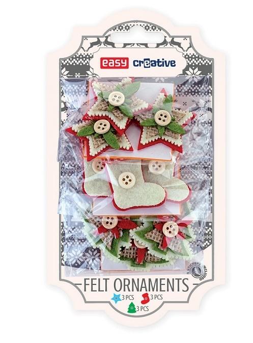 Trójwymiarowe ozdoby filcowe – motyw świąteczny: gwiazdy, skarpety choinki Zestaw zawiera 9 elementów: 3 gwiazdki, 3 skarpety, 3 choinki. Ozdoby w różnych kolorach i rozmiarach. Wszystkie elementy wykonane zostały z miękkiego, przyjemnego w dotyku filcu.